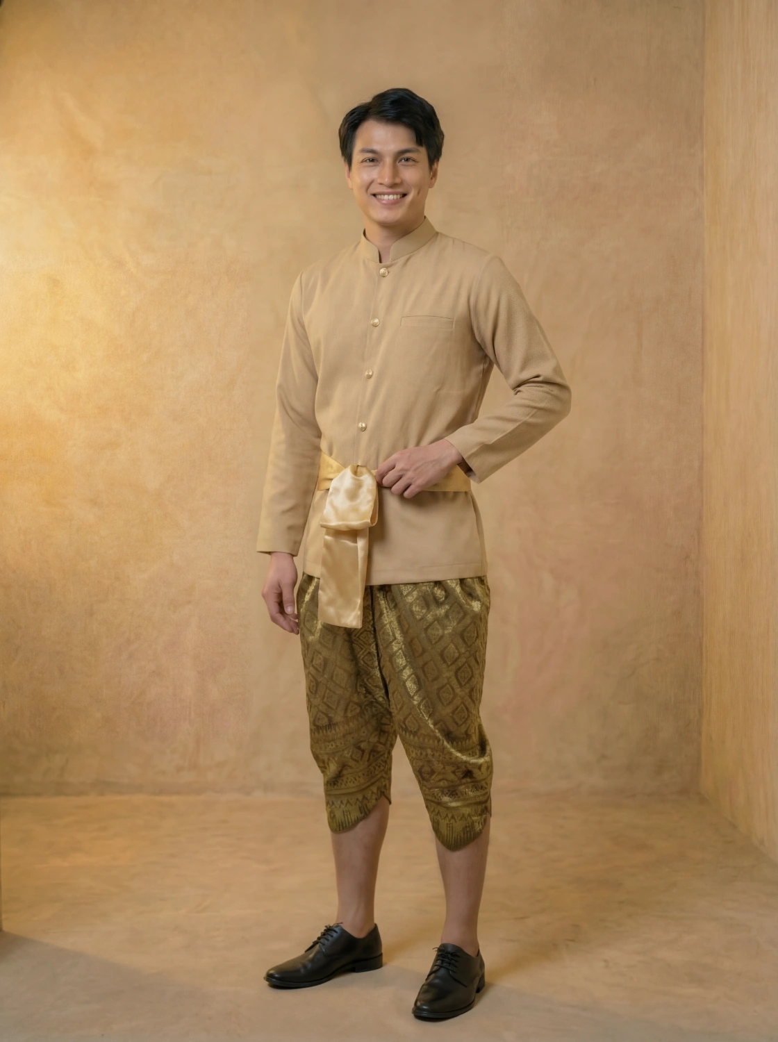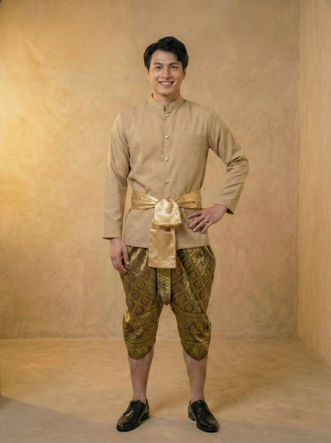 Channel the iconic “Pee Muen” look with ‘The Sirichai’—a complete 3-piece Thai ensemble inspired by Thailand’s beloved period drama. This set features a tailored Raj Pattern shirt in rich earth tones, beautifully draped Chong Kraben pants, and a coordinating waist sash.